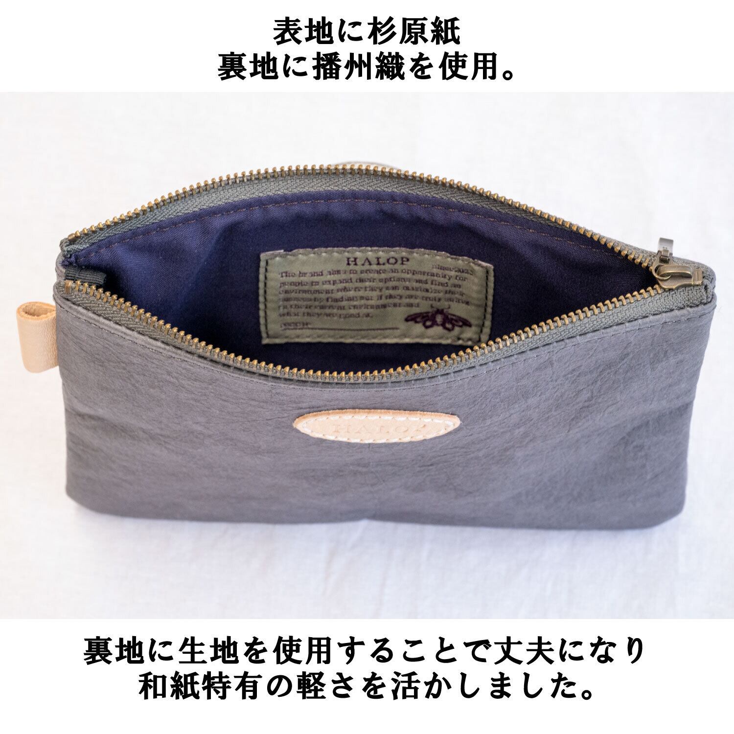 ■表地に杉原紙、裏地に播州織を使用。裏地に生地を使用することで丈夫になり、和紙特有の軽さを活かしたポーチ。
